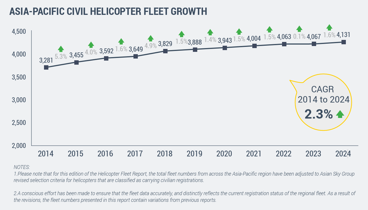 There were 4,131 civil turbine helicopters operating in the Asia-Pacific region at the end of 2024, which was an increase of 64 over the previous year. While this 1.6% year-on-year fleet growth in the region seemed modest and was similar to the annual percentage growth during the period 2019 – 2022, the Asia-Pacific based fleet has in fact grown by 850 units during the past 10 years, with a year-on-year compound growth of 2.3% since 2014.