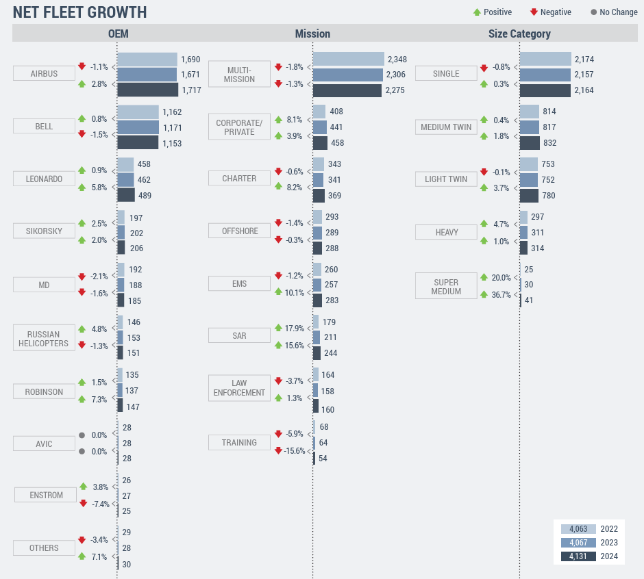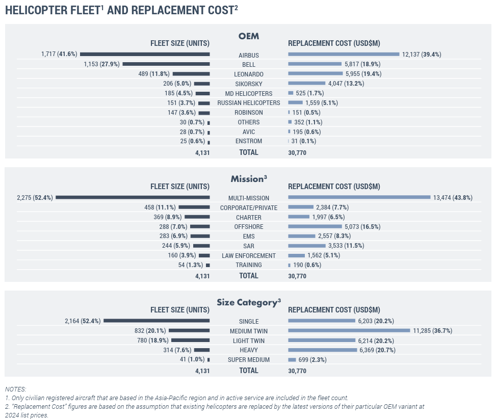 Some 133 helicopters were removed from the Asia-Pacific based fleet during 2024 through retirements and exports out of the region. There were 35 permanent retirements, which comprised mainly of older helicopters such as the Bell 206, Bell 412 and AS350.
