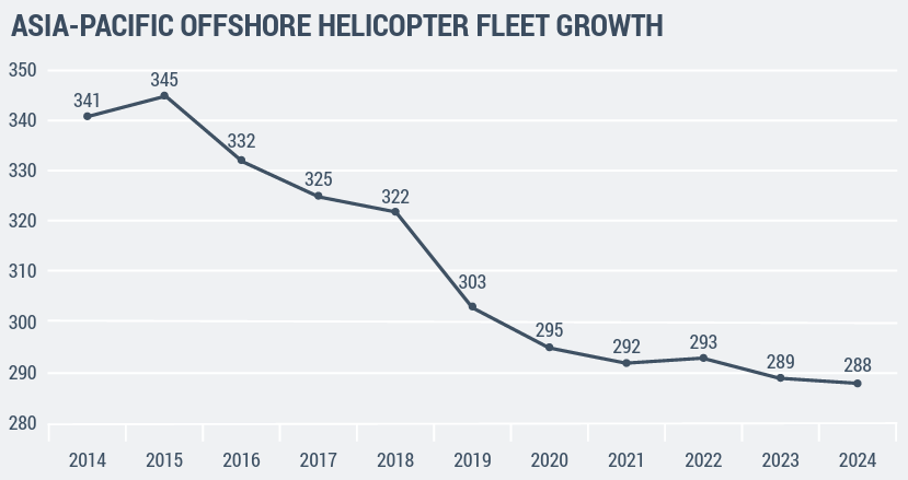 There were 288 Offshore support helicopters in operation in the Asia-Pacific region at the end of 2024, which was 21.0% of the global fleet. This was a 15.5% reduction compared to the end of 2014, when the total fleet comprised 341 helicopters. The Baker Hughes yearly rig count shows that there were 100 active Offshore oil rigs in Asia-Pacific at the end of 2024, more than any other region. This represents a 13.8% decrease over the number of active rigs in 2014, and is consistent with the change in fleet size. The active Offshore rig count in Asia-Pacific reached a low of just 70 in 2021, but has since increased by almost 43.0%.