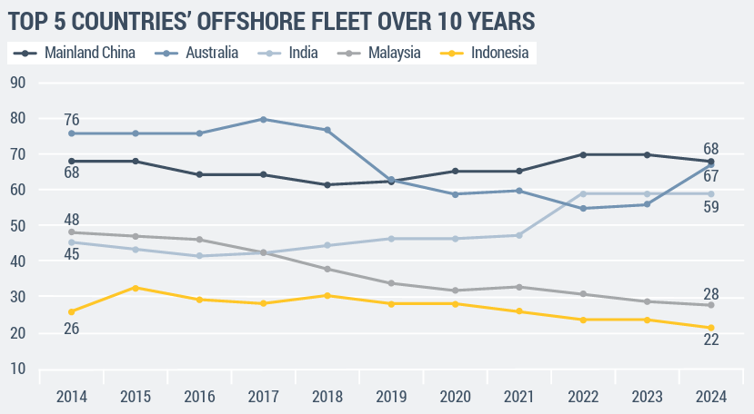 Mainland China had the largest Offshore support fleet at the end of 2024 with 68 helicopters in operation, with the fleet size has remaining fairly consistent over the past three years. Mainland China also had the highest number of active Offshore oil rigs in Asia-Pacific with a total of 48. Australia had a based fleet of 67 while India’s based Offshore fleet comprised 59 helicopters. India also had the second highest number of active Offshore oil rigs in Asia-Pacific, and was also the only country in Asia-Pacific to record a net increase in Offshore fleet size between 2014 and 2024, with an additional 14 helicopters.