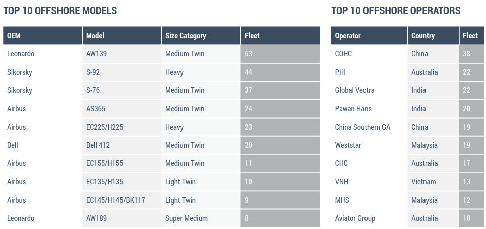China’s COHC had the largest Asia-Pacific based Offshore fleet with 38 helicopters, and was also the overall largest civil turbine helicopter operator in the region. PHI Australia and Global Vectra of India each had 22 Offshore helicopters at the end of 2024. Other major operators in the region included Pawan Hans of India (20 helicopters), China Southern GA (19) and Weststar of Malaysia (19).