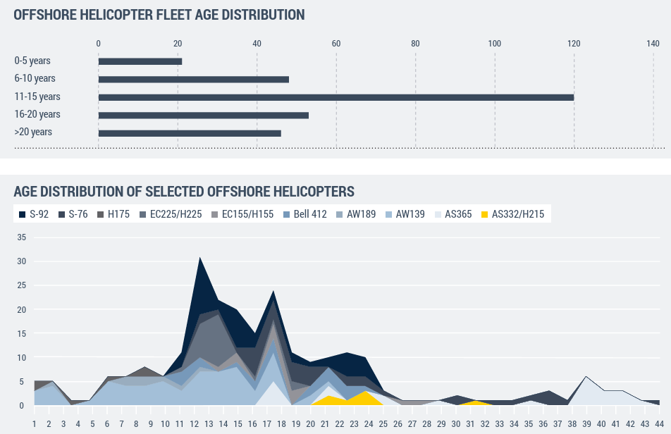 Some 65% of the Asia-Pacific based Offshore fleet is 10 years or older, with 16.0% being 20 years or older. The need for replacements will be increasing in the next 10 – 15 years, starting with the oldest, out-of-production types such as the AS365, EC155 and S-76. Heavy types including the H225 and S-92 would also require replacements, due to both ageing and the expected switch from Heavy types to more efficient Super Mediums and Medium Twins.